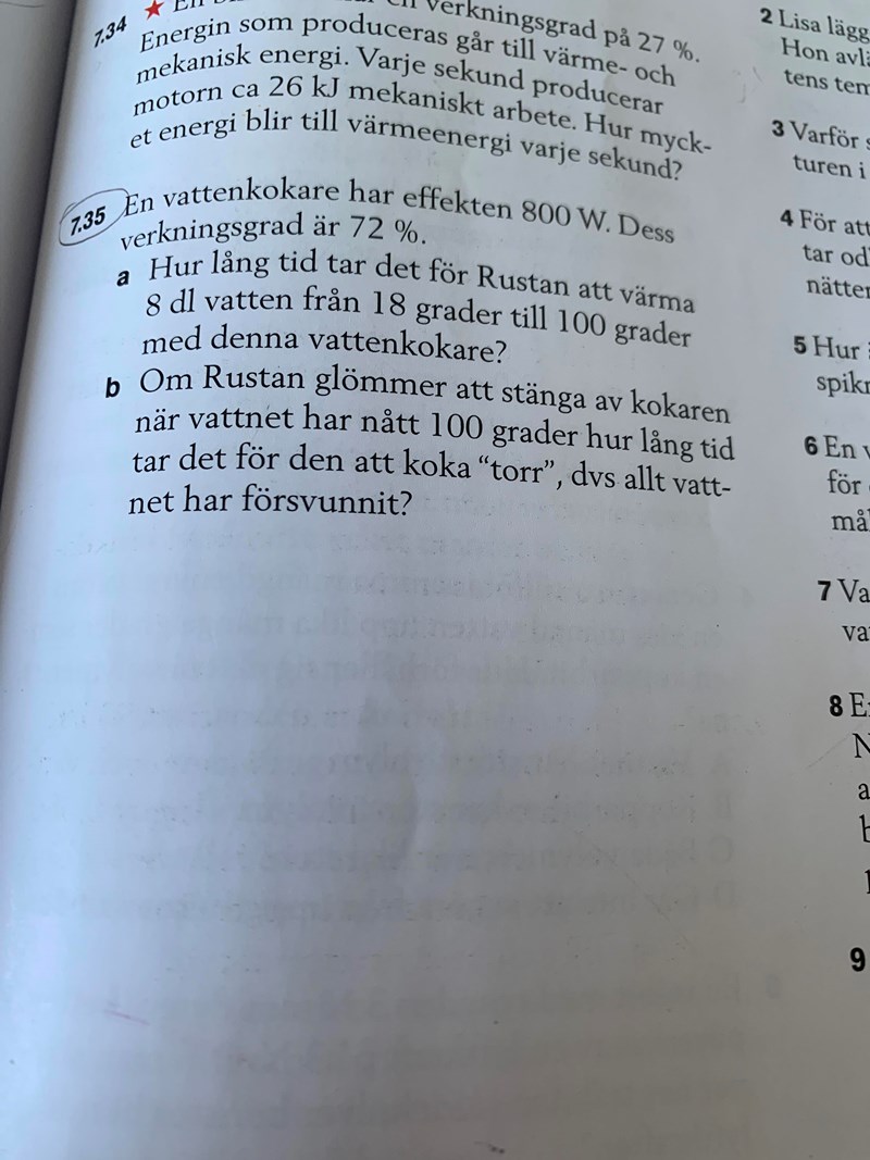 Till vattnet tillförd effekt är inte 800 utan 0,72•800 pga verkningsgraden