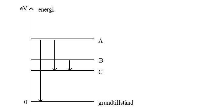 I figuren återges ett förenklat energinivådiagram för en atom. Då atomen övergår från nivå A till grundtillståndet utsänds elektromagnetisk strålning av våglängden 240 nm. Då atomen övergår från nivå B till C utsänds strålning av våglängden 1240 nm. Vid övergången från A till C utsänds strålning med våglängden 410 nm.