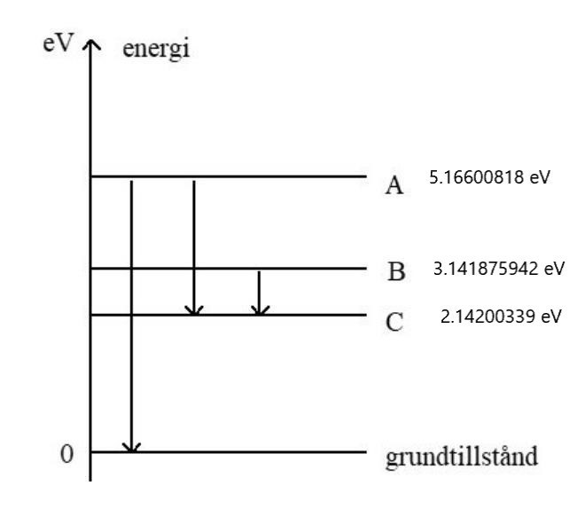 b) Vilken energi (i enheten eV) har nivån B om grundtillståndet svarar mot 0 eV?