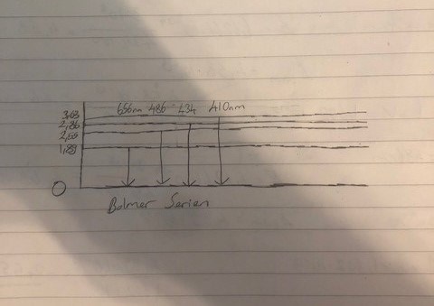 Frågan a har jag löst det är b som jag behöver hjälp med, är lite osäker hur jag kan rita energinivådiagram. Jag vet att det är balmer serien när jag kollar på dessa 4 våglängder och så vet jag att ju större energi ju mindre blir våglängden.