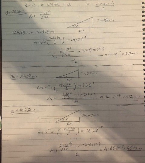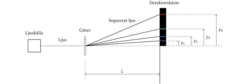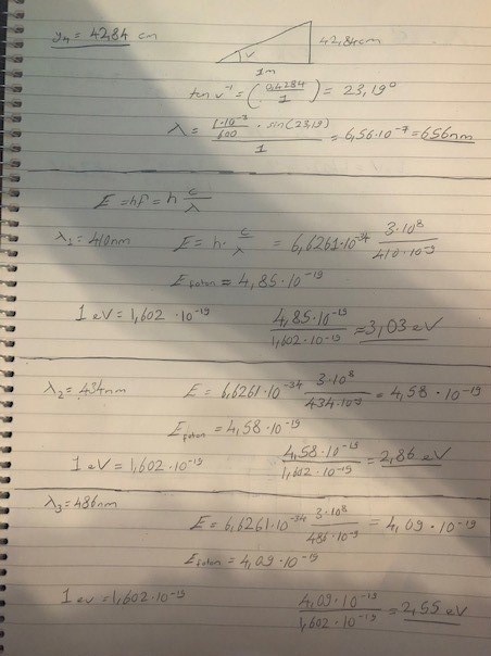 a) Beräkna våglängden, samt fotonenergin, för det ljus som motsvarar varje observerad spektrallinje. Våglängden ska anges i enheten nanometer och fotonenergin ska anges i enheten elektronvolt (eV).