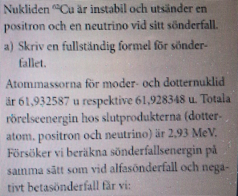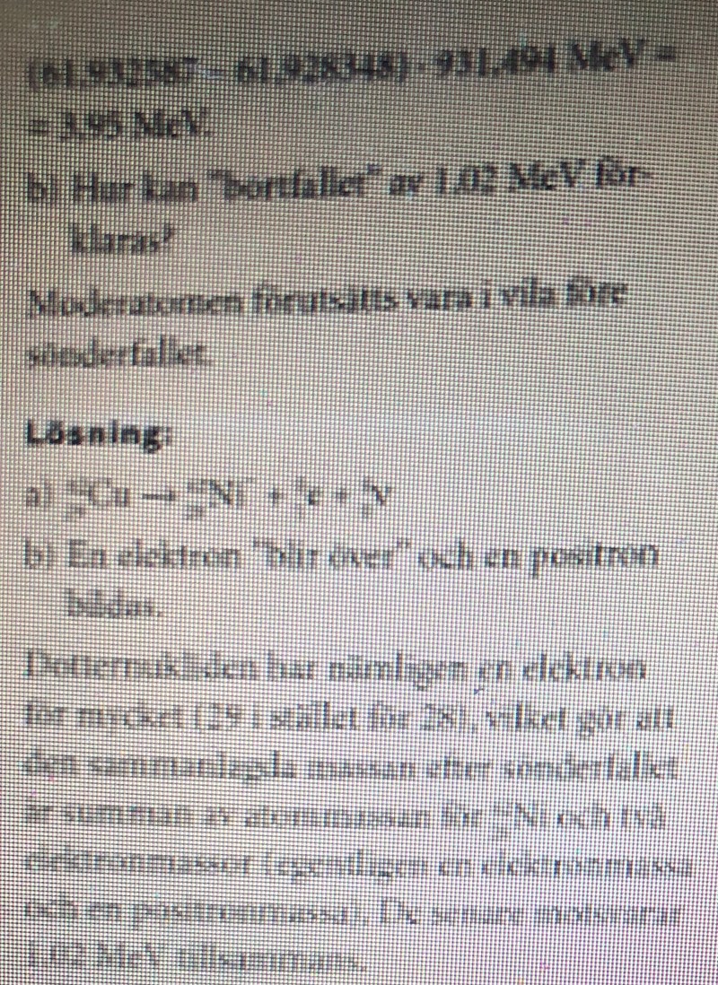 I exemplets b) uppgift varför säger man att denna överskottsenergi går till positronen och elektronen då man i beskrivningen redan skrivit att dotternukliden och positronen får energi? Tack på förhand