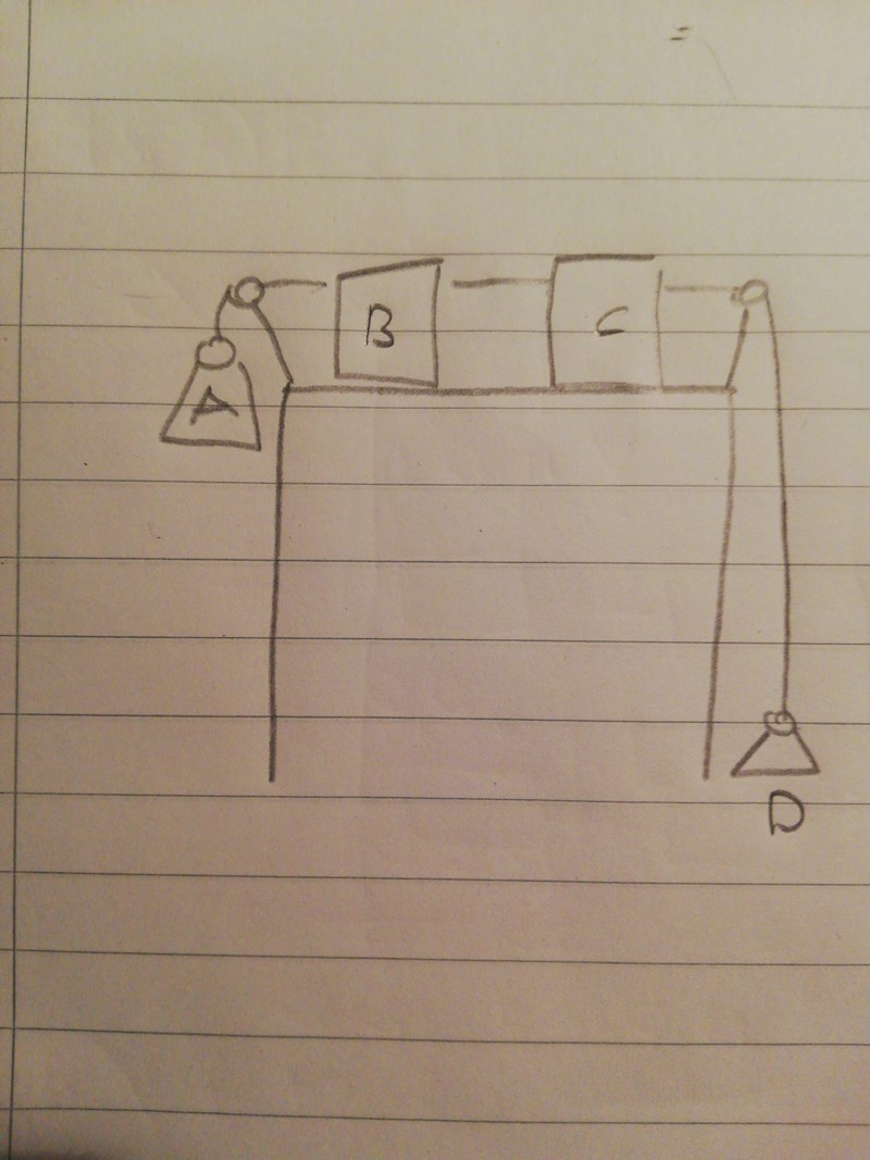 Jag har en fråga angående följande exempel. Anta att man släpper på vikt a och den faller mot marken. Frågan är då, vad kommer A:s lägesenergi omvandlas till? Jag tänkte ju att den kommer omvandlas till rörelseenergi för A, rörelseenergi för B och C, och lägesenergi till D. Men läraren säger att det också ska omvandlas till rörelseenergi till D. Hur kan det bli så? Blir inte all D:s lägesenergi i slutändan till lägesenergi eller vad är det jag missar?