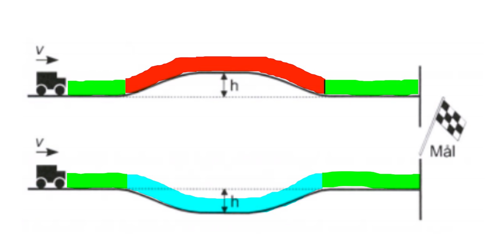 Den övre bilen: ek vid utgångshastigheten med  Ep, vid backen får vi både Ek och högre Ep och eftersom den mekaniska energin är konstant så blir Ek lägre än vid  början. Efter kullen får vi  Ek och Ep och då går det lika snabbt som början.
