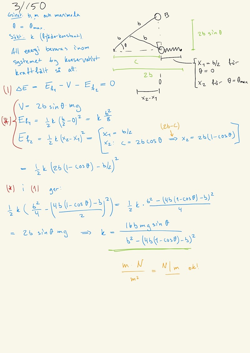 I beygnnelseögonblicket har fjädern energin (1/2)k*(b/2)^2. Detta ska vara lika med energin i slutögonblicket. Då har kulan en potentiell energi som är m*g*2*b*sin(thetamax) och fjädern har energin (1/2)*k*x^2, där x är utsträckningen av fjädern.
