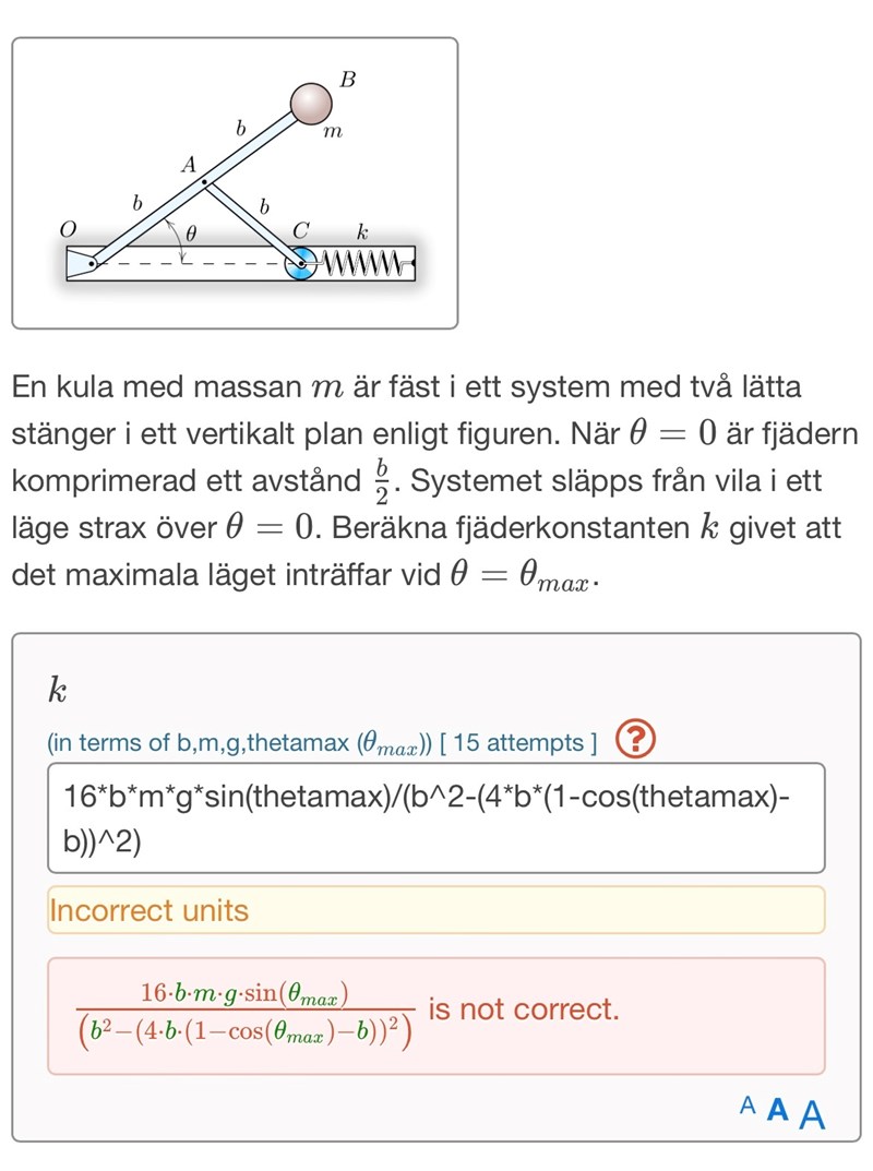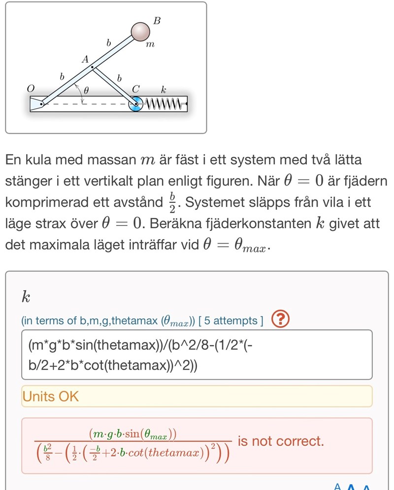 Jag har insett nu att b(sin(2thetamax))/(sin(thetamax)) ju inte är 2bcot(thetamax) utan 2bcos(thetamax). Men det blir fortfarande inte rätt. Kan du se något mer där jag har gjort fel? Jag har tittat igenom mina beräkningar flera gånger utan att hitta något mer.