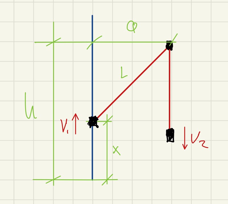 I läge 2 befinner sig hylsan i nivå med trissan, så x = h, och v2 blir noll oavsett vad v1 har för värde.