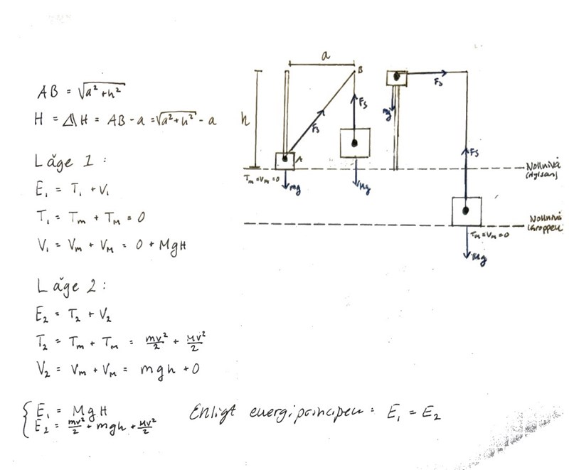Men sen kom jag på att om vi sätter nollnivån för vikten vid viktens position i läge 2 så borde den väl ha kinetisk energi (Mv^2/2) i läge 2? Men jag lyckas inte få till det så det matchar svaret....