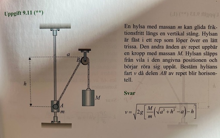 Har fastnat på en uppgift i mekanik. Dels så undrar jag om man får sätta olika nollpunkter för hylsan resp. vikten? Känns som de mest rimliga med tanke på att man inte vet skillnaden i höjd mellan hylsan och vikten i läge 1.