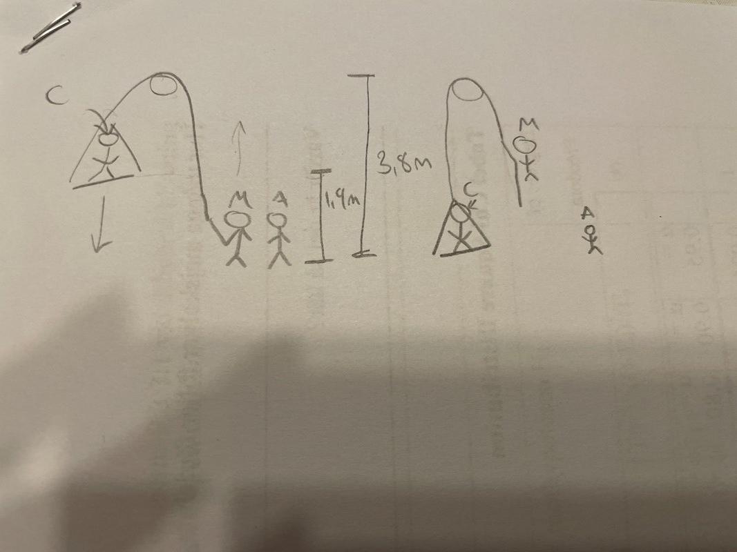 Börja med att rita - dels situationen när Anna tappar taget (och Carl är halvvägs upp,och Maria är på marken), dels när Carl ramlat i marken (hur högt upp är Maria då?). Lägg upp bilderna här.
