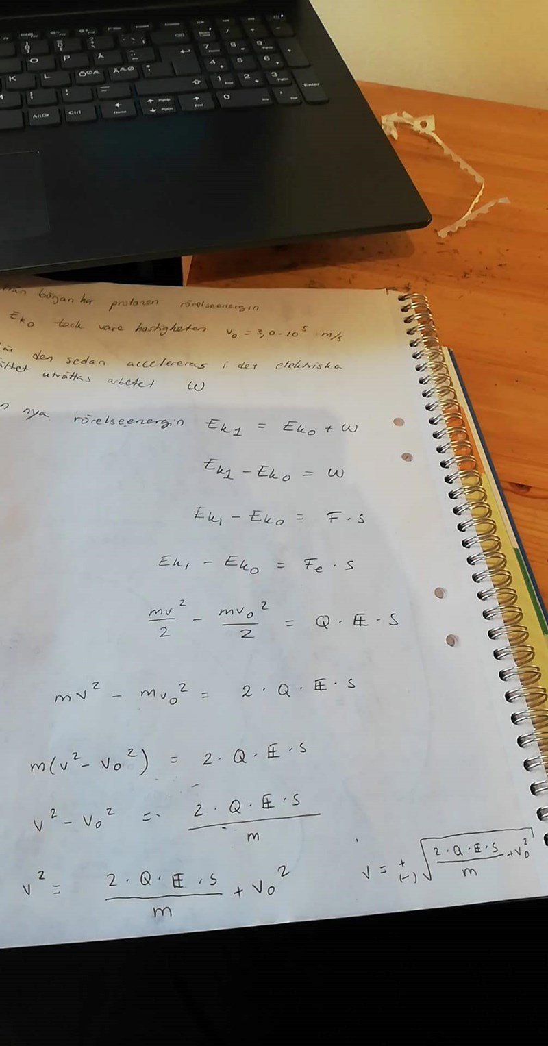 Från början har protonen rörelseenergin tack vare hastigheten . När den sedan accelereras i det elektriska fältet uträttas arbetet . Den nya rörelseenergin måste alltså uppfylla .