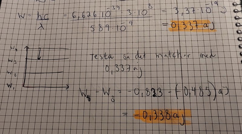 Nu vet jag inte om jag tänkt rätt, men vi vet ju att fotonens energi är skillnaden mellan två nivåer. Fotonens energi blev ca 0,337 aJ och om den ska hoppa ned blir det från nivå 4 till 3.