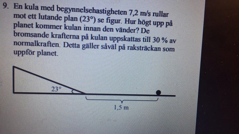 det borde väl vara hsinθ som jag skrev som sträcka för friktionskraften på rampen. om man antar att h är som jag beräknade den får jag att sträckan skulle vara 3,28 (m). men jag tror jag förstår hur du menade med energins minskning. att den gick från att minska med 4,5 joule i 1,5 meters sträckan till att nu minska med 9 joule på rampen. om man tänker att det förloras dubbla mängden energi och ifall friktionskoefficienten är desamma borde det bara vara dubbla sträckan, alltså 3 meter. men vad borde man göra med den längd som kulan rullar?
