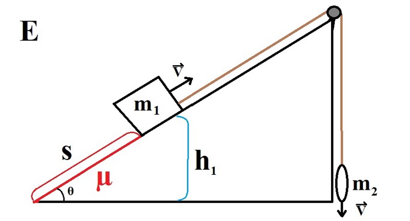Luftmotstånd och friktion i trissan försummas. Riktningen som man kan se är då rör sig uppför rampen då sträckan är lika med höjden på grund av triss systemet. Under sträckan påverkas klossen av friktionsarbete. Med hjälp av följande variabler,