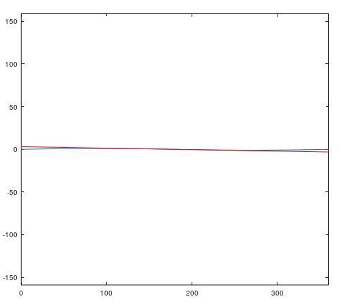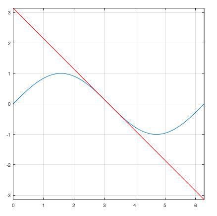 Var du än väljer att rita din tangent i figur 2 så kommer lutningen att vara väldigt nära 0. Den kommer att ligga mellan Därför ser den röda linjen nästan horisontell ut. Lägg märke till att den blåa sinuskurvan fortfarande är "en våg" mellan 0 och 1 på y-axeln precis som i figur 1.