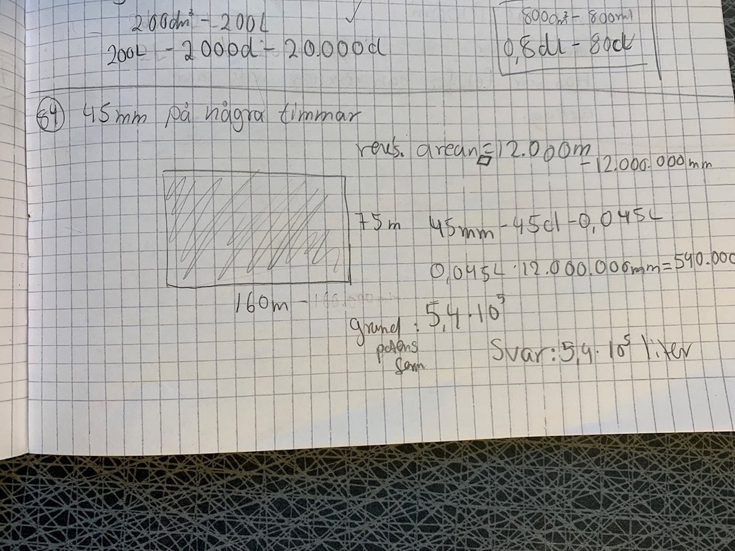 Vi har ett rätblock med sidorna 160 m, 75 m och 45 mm, eller 1600dm, 750 dm och 0,45 dm. Multiplicerar man ihop får man 540 000 liter = 5,4.105 liter, precis som du fick.