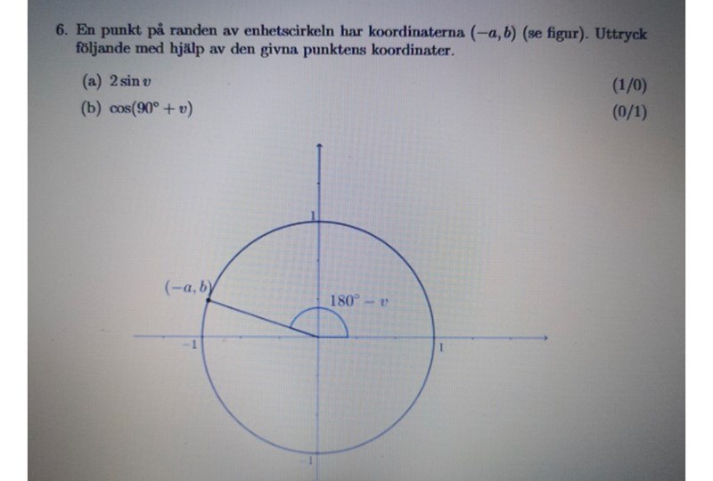 Kan jag få hjälp med b uppgiften. Jag vet att koordinaterna ska vara (a,b) om man adderar 90 grader + vinkeln v. Men jag förstår inte hur man ska tänka och cos anger ju x kooridnaten. Så isåfall bör det vara a som är svaret i b uppgiften. Är det rätt?