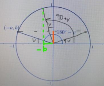 Grön och röd linje i bilden är lika långa. Båda har längden b. cos(90+v)=-b