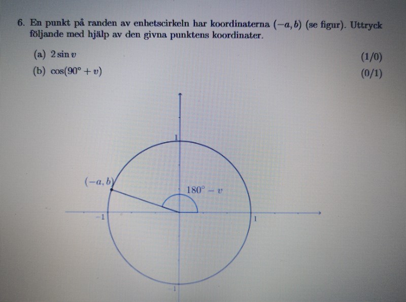Rita vinklarna v och 90o+v i enhetscirkeln så ser du att