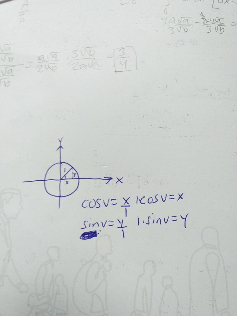 Jag antar att du vet att cos v är närliggande katet delat med hypotenusan och att sin v är motstående katet delat med hypotenusan (det är det du har skrivit i dina beräkningar). Finessen med enhetscirkeln är att hypotenusan är 1 och att det är enkelt att dela med 1 :). Det ser vi också i din bild. Vad menar jag med det? Jo, i din utmärkta figur har du ritat en rätvinklig triangel och du har markerat en vinkel. Värdena x och y i din bild är koordinaterna för punkten där hypotenusan (=din markerade radie) slutar. D.v.s. om du låter din radie rotera kring origo så kommer du hela tiden att kunna avläsa sinus- och cosinusvärendena på axlarna. Det är sinus och cosinus av den vinkel som du har markerat och som kommer att ändras när radien roterar. Fråga igen om du inte förstår vad jag menar.