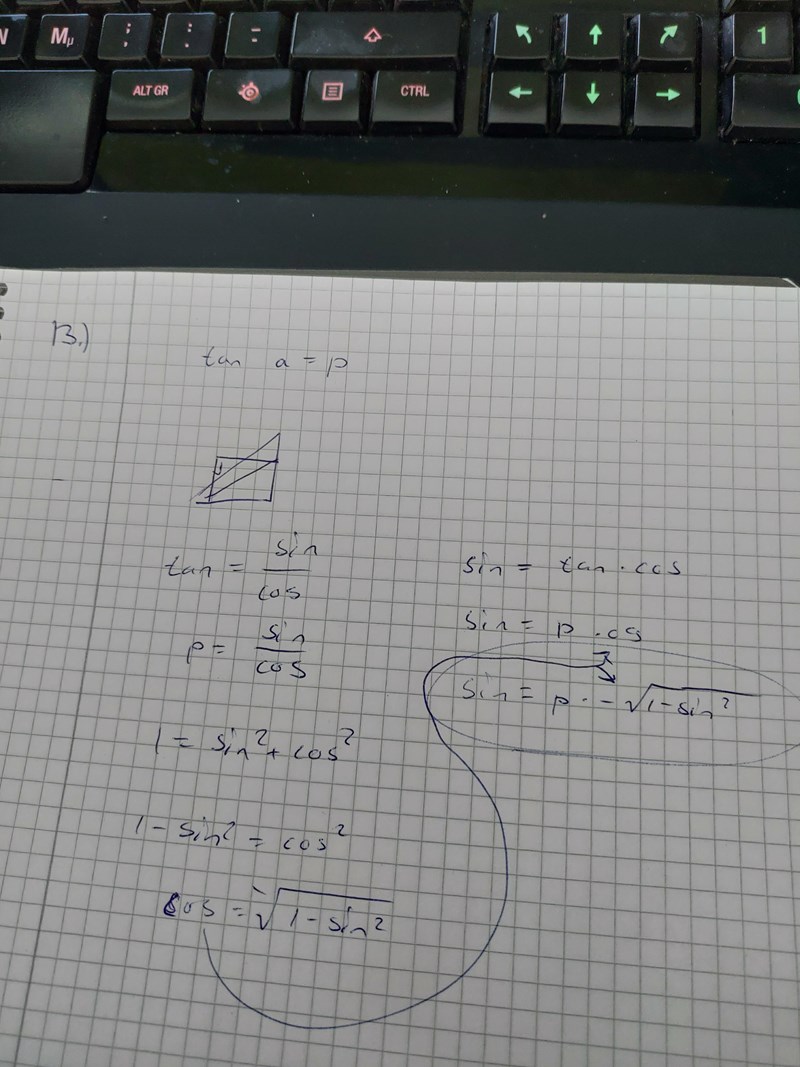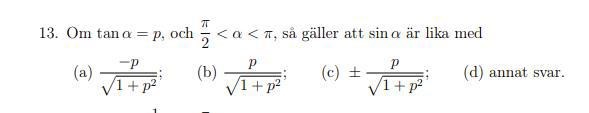 Jag förstår inte hur man ska komma fram till a). Nedan är min lösningsförsök. Om sin a = p, så skulle jag förstå svaret men inte tan a = p.