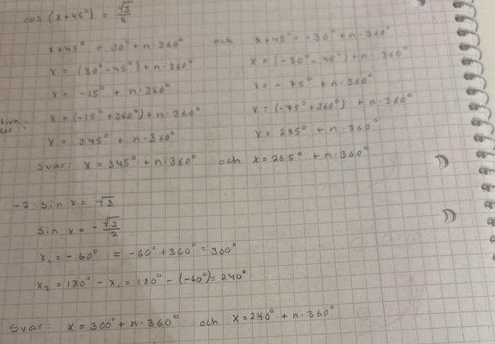 Jag löser just nu trigonometriska ekvationer med exakta värden. I bokens exempel ( se nedan) står det att man föredrar positiva värden på vinklarna och har där lagt på ett varv på den negativa vinkeln för att den ska bli positiv. När jag läste uppgifterna i boken trodde jag därför att det var bäst att svara med positiva vinklar, men det hade tydligen inte facit gjort, utan de hade svarat med negativa vinklar. Jag undrar om ni skulle kunna kolla på dessa och se om de stämmer? Och är det okej i båda fallen?