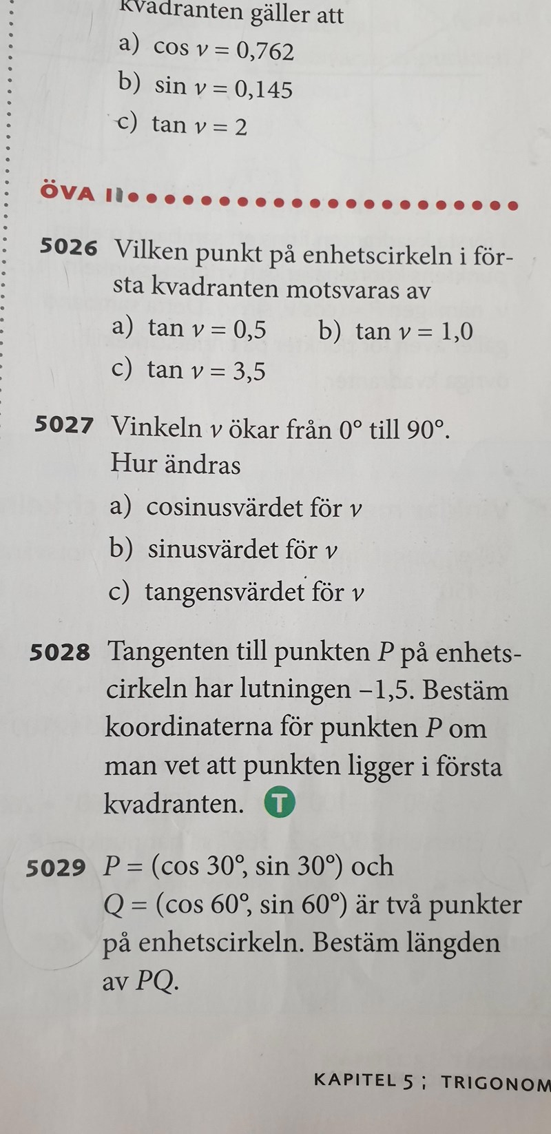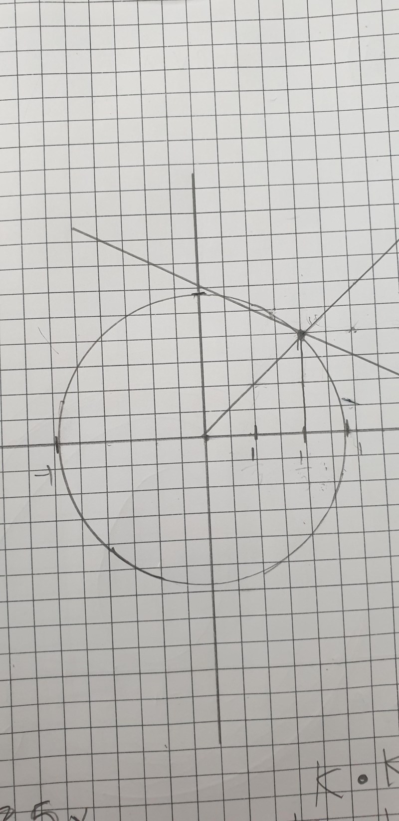 Precis. Om punkten P har koordinaterna (x, y), så är radiens lutning y/x. Sedan måste man komma ihåg att (x, y) skall ligga på enhetscirkeln samt i första kvadranten.