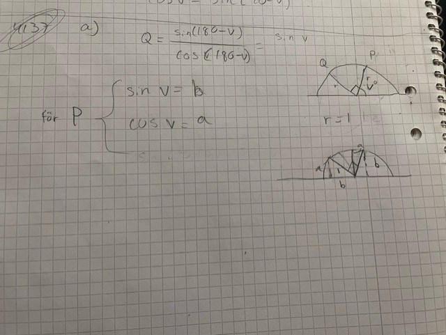 man kan även lösa den för linjerna p till origo och Q till origo är vinkelräta mot varann så b/a *x=-1 så då är Q=a/(-b). Men undrar fortfarande om man kan ta fram svaret med sin v och cos v