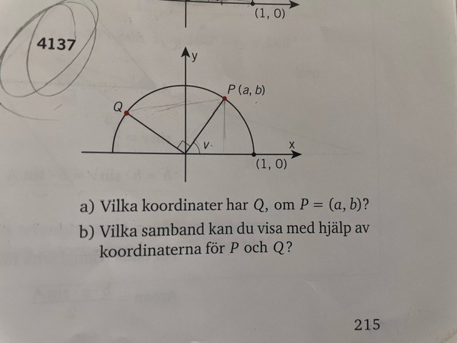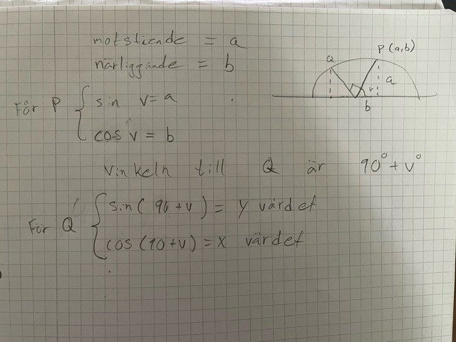 Punkten P har koordinaterna (a,b) = (cos(v), sin(v)). Vilka koordinater har punkten Q? Tänk dels på hur långa de båda kateterna i triangeln är, dels på att punkten skall hamna i rätt kvadrant.