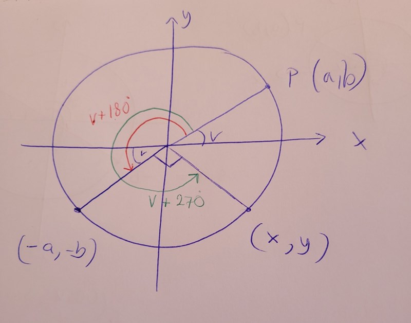 Titta på linjen som representerar v+270o. Var någonstans hittar du en vinkel (till en av koordinataxlarna) som är v ?
