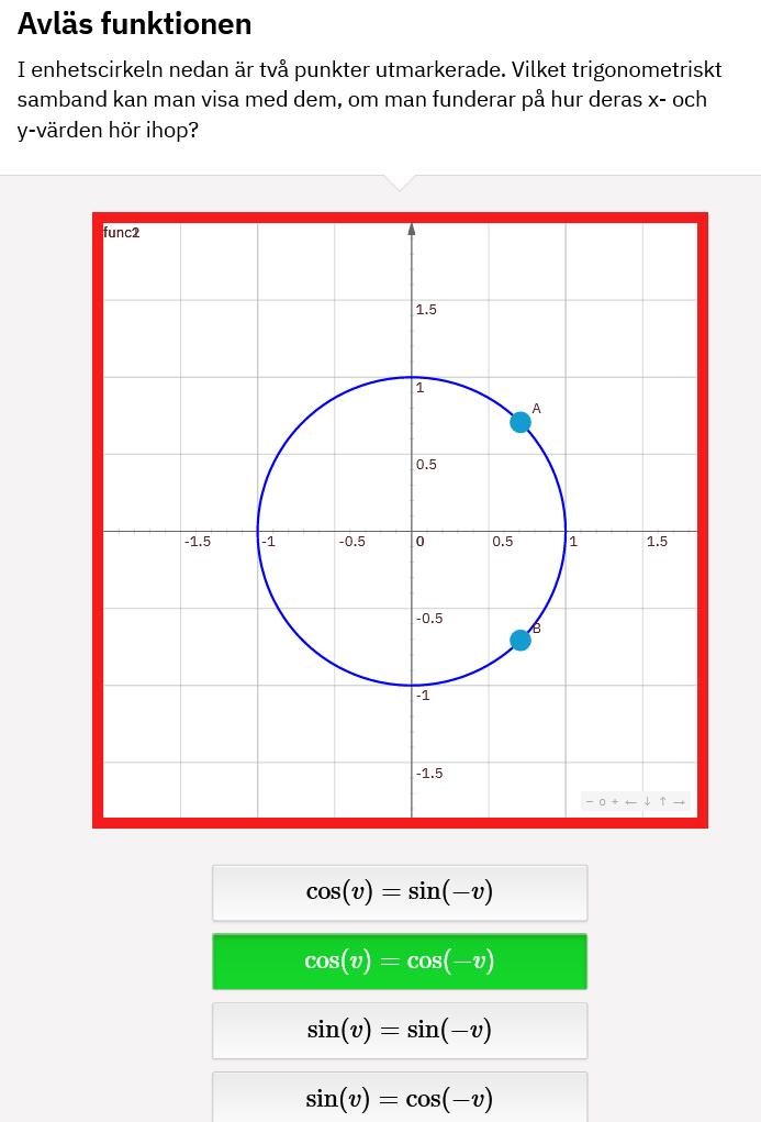 Nu har punkterna istället samma värde på x-axeln, och x-axeln motsvarar cosinusvärdet. Punkten A har vinkeln v och punkten B vinkeln -v. De har samma x-värde och alltså samma cosinusvärde. Mao, cos(v) = cos(-v)