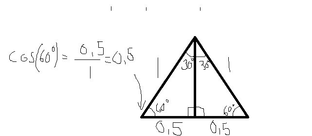 cos60 kan du få reda på genom att liknande rita upp en liksidig triangel med vinkeln 60 grader som du delar till två