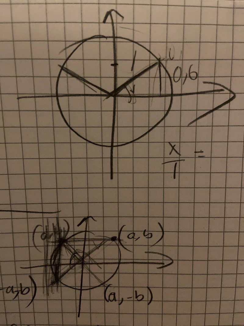 Jag har inte kommit någonstans förutom att jag testade att rita upp en enhetscirkel och markerade där y=0.6 vilket gav mig två möjliga x-värden. Dock, vet jag inte svaret.