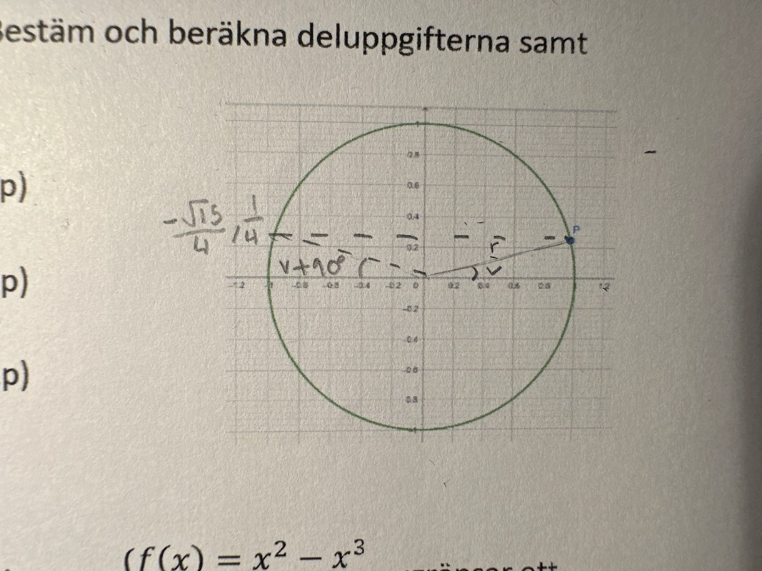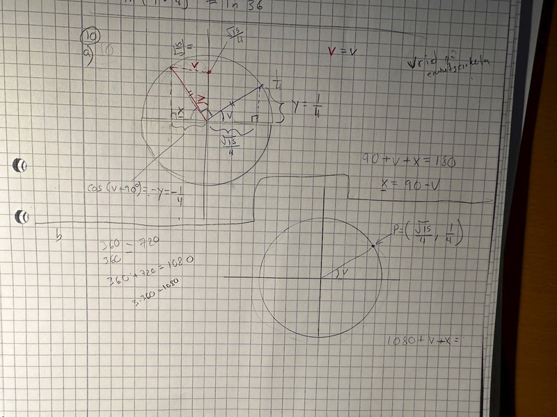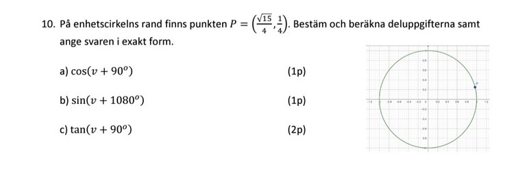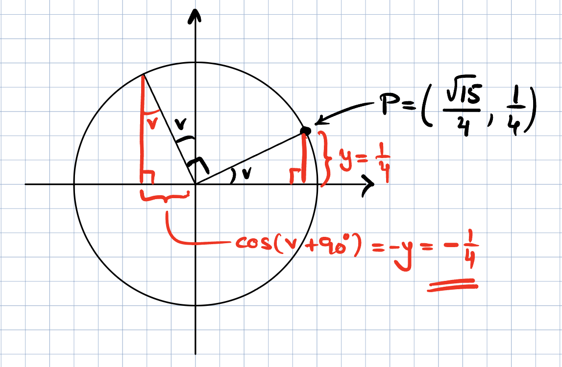 Märk sedan ut vinkeln v+90° och märk ut punkten. Vilken x-koordinat (eftersom de frågar efter cos) har denna punkt?