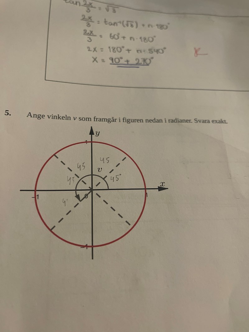 Hej! Kan någon förklara hur jag ska tänka? Jag tänkte att svaret är 225 grader vilket blir 5*pi/4. Men jag är osäker