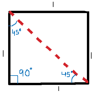 Eftersom sin(v) = "motstående katet"/"hypotenusa" och cos(v) = "närliggande katet"/"hypotenusa" så kan du nu enkelt beräkna sin(45°) och cos(45°).