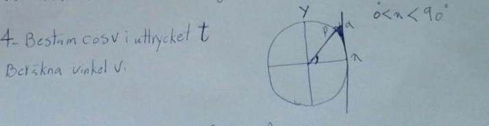 Hej! Jag har fastnat på ett uppgift och jag har svårt att förstå hur jag ska komma fram till detta. Hur man kan bestäm cos v i uttrycket t? Vad menas med den?
