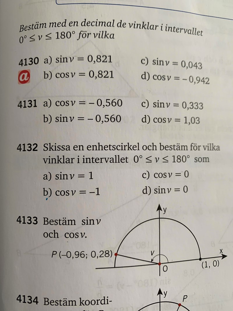 Du verkar blanda ihop sinus och cosinus. För sinus gäller det att sin(v) = sin (180o-v) eftersom en vågrät linje skär en enhetscirkel på två ställen lika långt från y-axeln. När det gäller cosinus, så har en lodrät linje två skärningspunkter med enhetscirkeln, en ovanför och en under x-axeln, men eftersom man i den här uppgiften endast är intresserade av värden i intervallet mellan 0 och 180 grader så är det bara ett värde som är intressant.