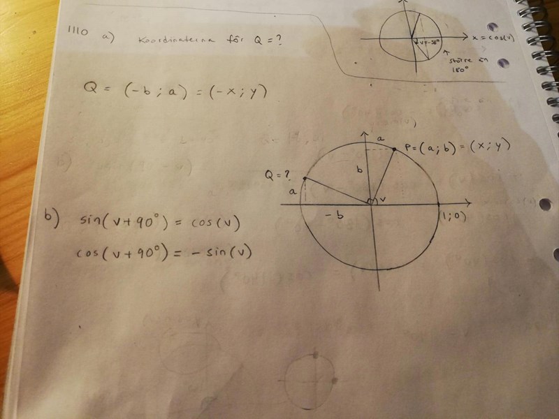 Du vet också att Q har koordinater (cos(v + 90°), sin(v + 90°))