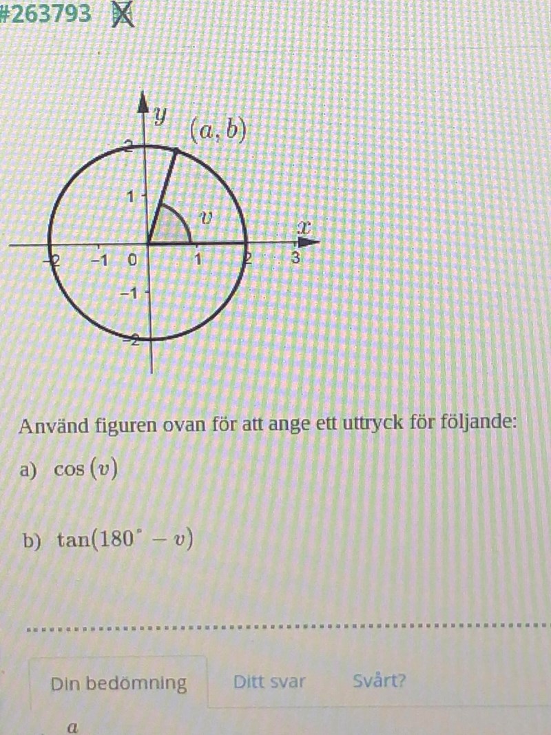 Nästan rätt på b-uppgiften, men det ska vara tan(180°)=b-a\tan(180^{\circ})=\frac{b}{-a}
