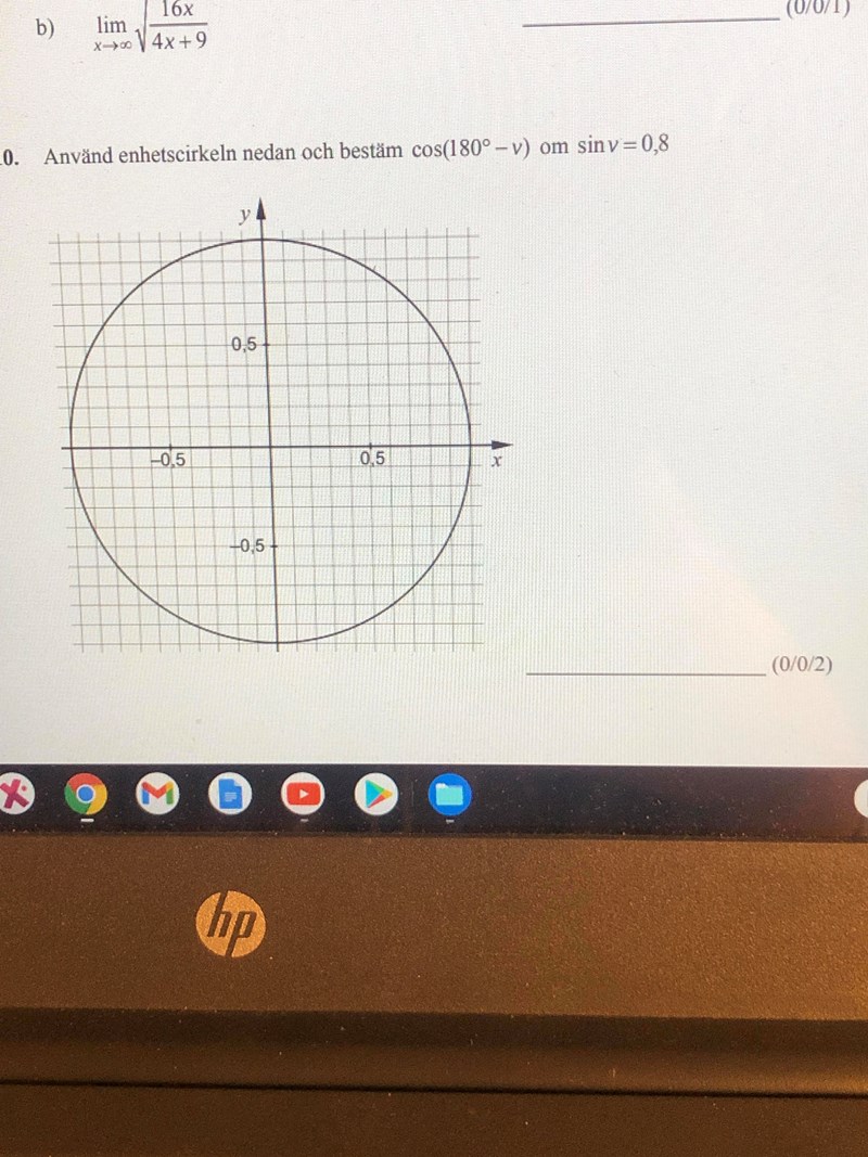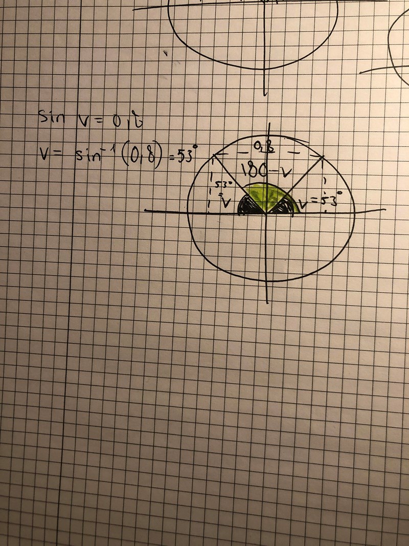 Jag vill ju ta reda på cos (180-v) dvs x- värdet för vinkeln 180-v vilket borde då bara ge ett svar? Vinkeln har jag markerat från positiva axeln och uppåt, där den slutar är koordinaten för x (negativ) och y (sin 0,8).