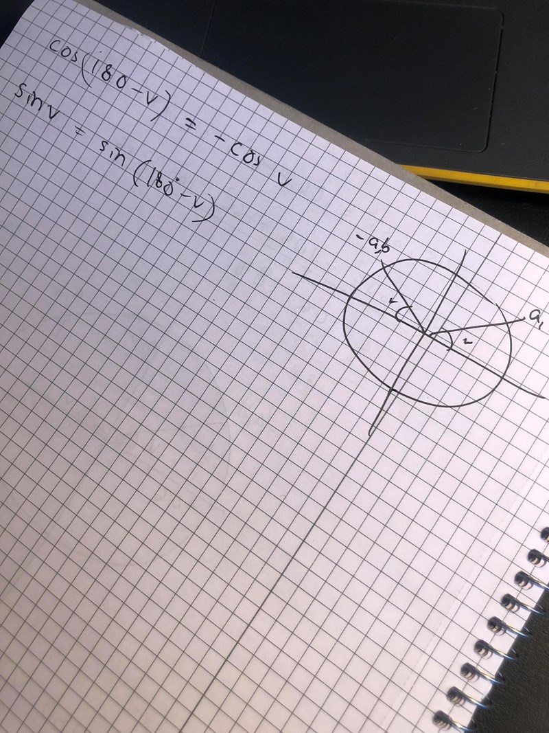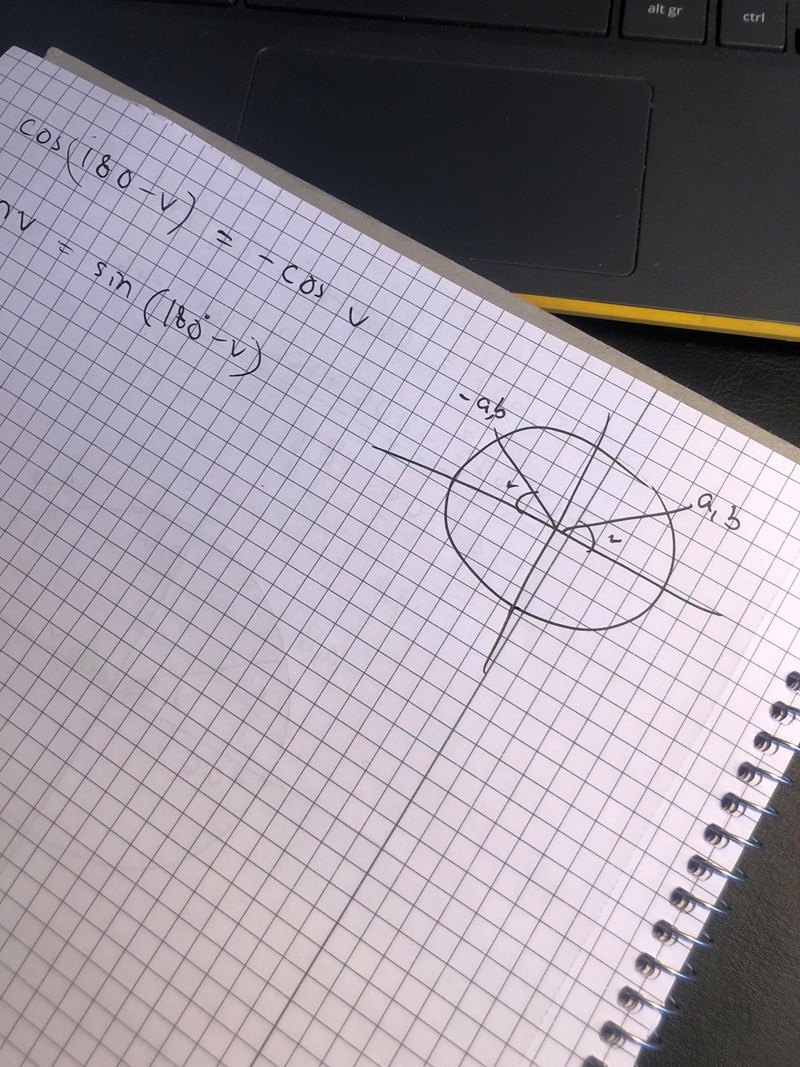 Det har jag gjort, där det är streckat ner mot x-axeln är det cos för vinkeln v. Men vad händer om det istället är 180-v istället för bara v?