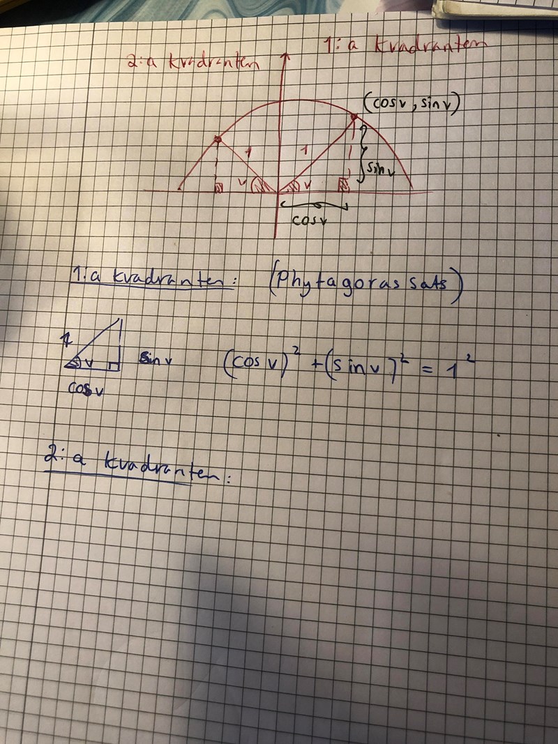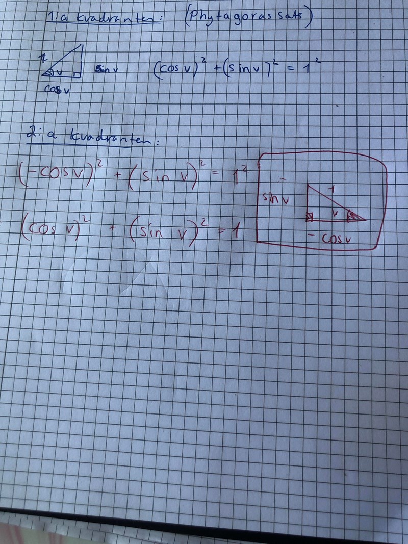 På samma sätt som i första kvadranten. Längden av kateterna är sin v respektive cos v, hypotenusan är 1.