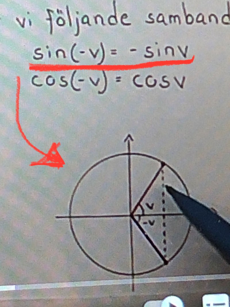 Håller du med om att de två punkterna borde ha samma y-värde, fast med motsatt tecken? Och det betyder isåfall att vinklarna har samma sinusvärde, fast med motsatt tecken. Så, sinus av -v är minus sinus av v.