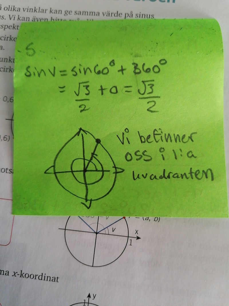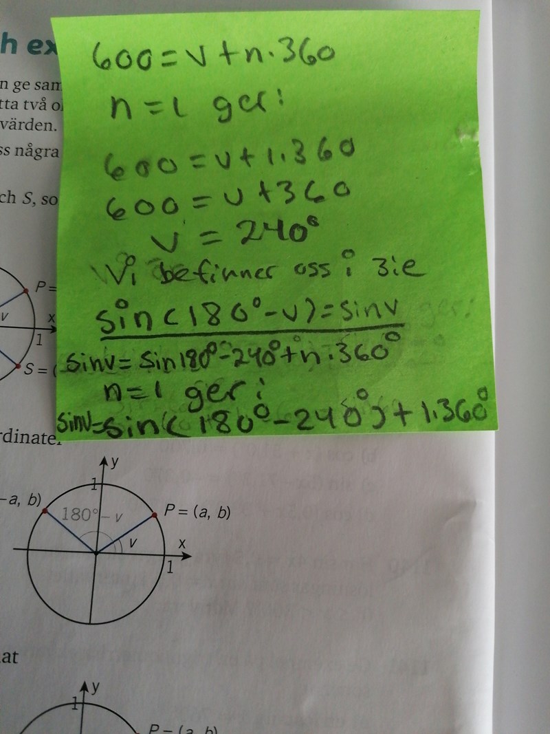 Du vet antagligen också att sin (v) = sin ((180 - v) + n × 360). Om n = 1, vad blir v? I vilken kvadrant befinner vi oss då. Övertyga dig om att sinus blir detsamma.
