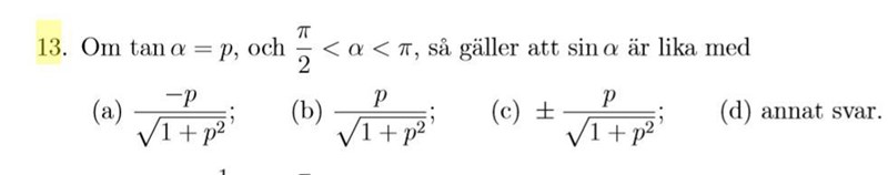 Du vet att tan x < 0 och att cos x = p, cos x under begynnelsevillkoret 90 < x < 180 är ett negativt tal så cos x < 0. Det betyder att p kommer att resultera i ett negativt värde under detta förhållande ( föreställ att det egentligen står -p om det underlättar för dig). Så resultatet kommer bli cos x = sin x som i sin tur motsvarar - tanx som stämmer överens med 90 < x < 180