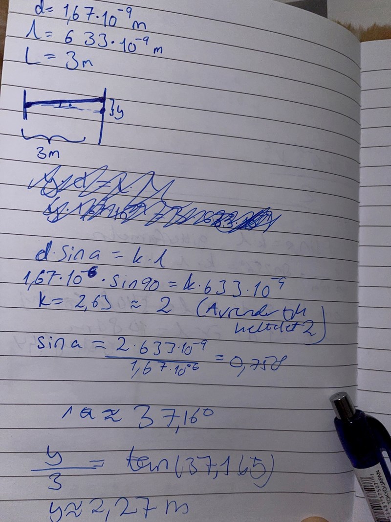 Ett gitter med gitterkonstanten belyses med monokromatiskt ljus av våglängden . Ljuset infaller vinkelrätt mot gittret. På en vägg parallell med gittret och på avståndet 3,0 m ser man ett antal röda ljusfläckar. Beräkna avståndet mellan de båda yttersta ljusfläckarna.