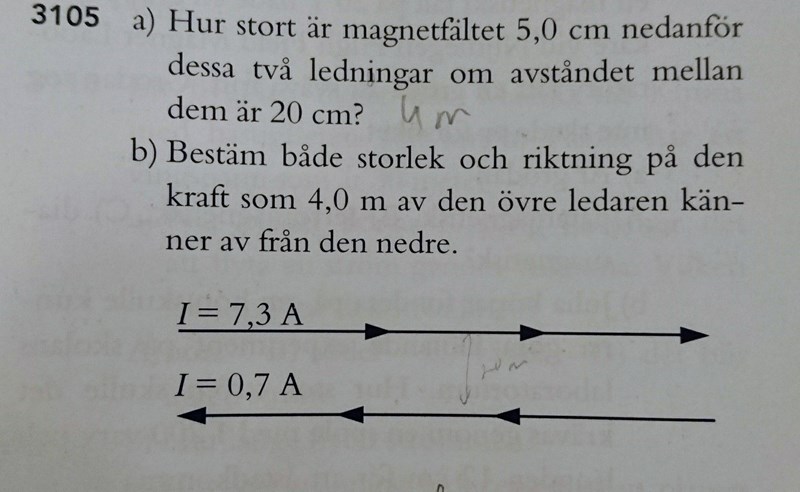 a) fick jag som 3µT. Men fråga b) förstår jag inte. Vad händer? Finns det redan en kraft 4 meter uppåt som känner en annan kraft? Kan någon omskriva det på en mer invandrarvanligt sätt?