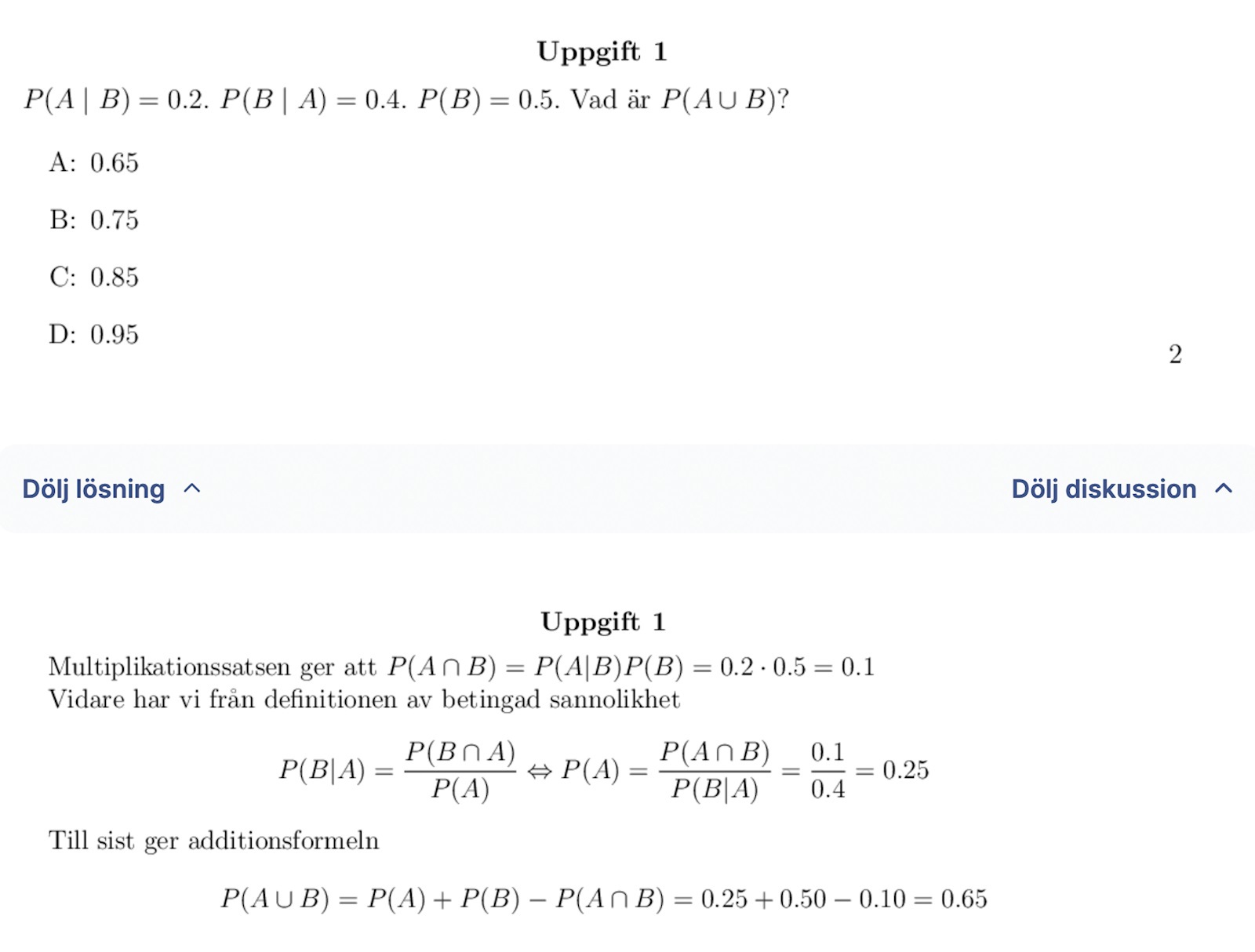 Jag har räknat ut P(A) precis som i facit. Men däremot får jag 0,15 när jag räknar ut P(A snitt B) med hjälp av multiplikationssatsen. Jag använder P(A)*P(B) = 0,25 x 0,5 = 0,125, medan facit använder P(A|B)*P(B) och får 0,2 x 0,5 = 0,1.