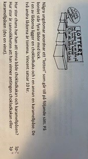 a) P(vinst) = P( choklad + godis). Han får lyfta två lådor, vilket ger 1+1 / 4 chans att vinna. Alltså 2/4 = 50%
